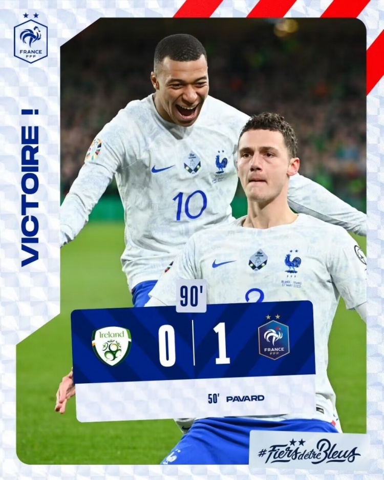 3月28日讯 北京时间3月28日凌晨2点45,欧洲杯预选赛B组次轮,法国客场挑战爱尔兰。上半场双方破门乏术。下半场帕瓦尔世界波建功,迈尼昂神扑力保城池不失。最终全场比赛结束,法国队1-0爱尔兰取得两连胜。积分榜方面,法国两战全胜积6分领跑,爱尔兰积0分暂列第4。