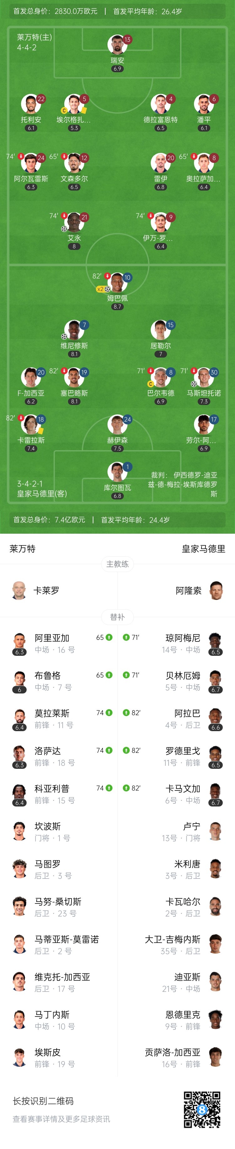 第66分钟,还是皇马的反击机会,中圈位置居勒尔送出精妙挑传,姆巴佩跟进单刀过掉门将低射入网,皇马4-1领先↓