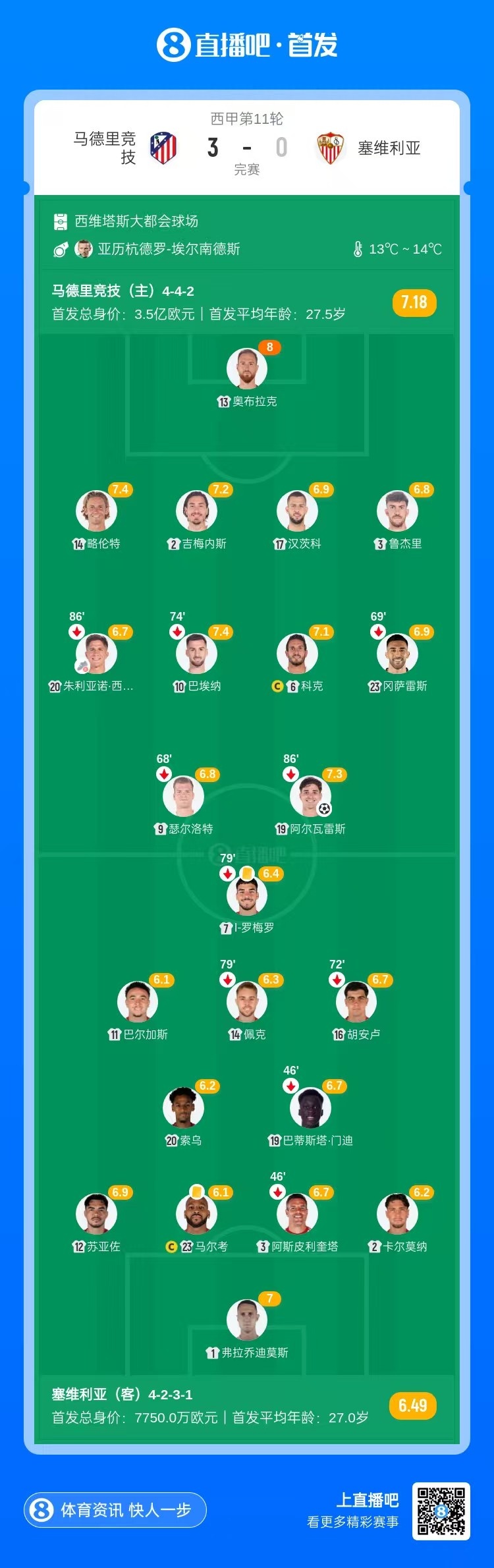 全场比赛结束,马德里竞技3-0塞维利亚。