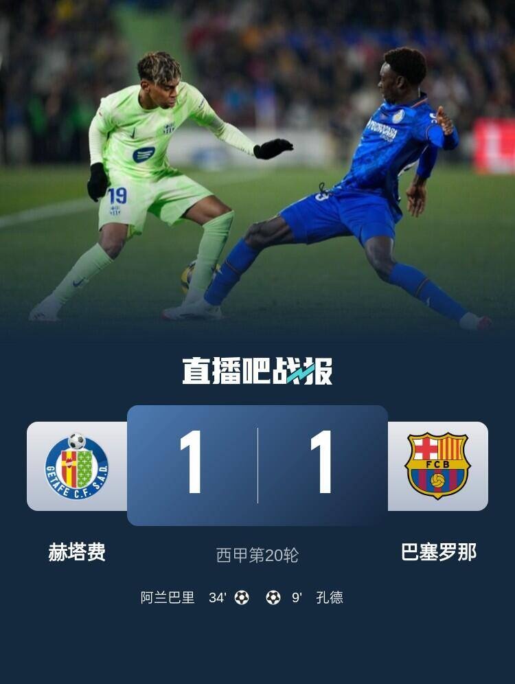 1月19日讯 北京时间1月19日凌晨4:00,2024-25赛季西甲联赛第20轮,巴塞罗那在阿方索-佩雷斯球场客战赫塔费。上半场孔德破门,阿兰巴里扳平,巴萨暂1-1赫塔费;下半场两队都没能改写比分,最终巴萨1-1赫塔费,距榜首5分,近8轮仅1胜仍居第三。