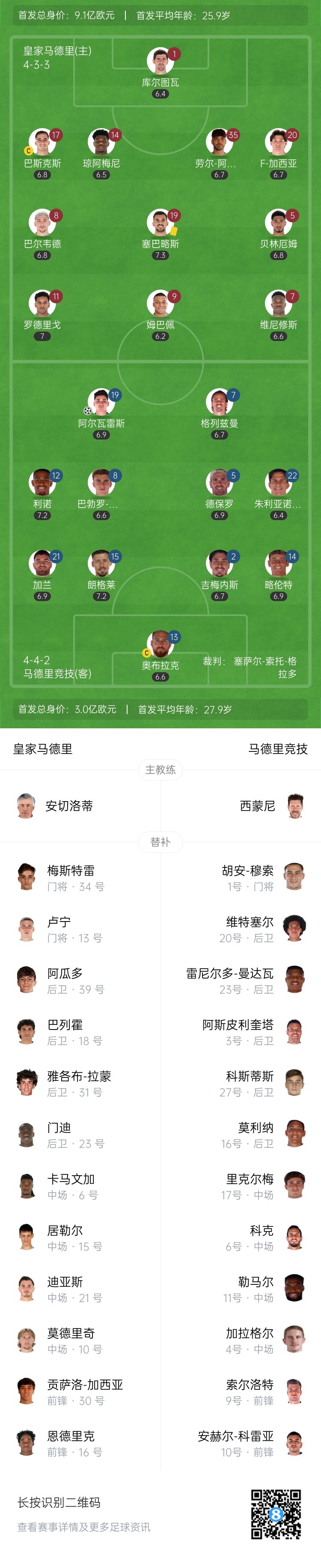 2月9日讯 北京时间4:00,西甲第23轮迎来榜首大战!皇马主场迎战马竞,比赛在伯纳乌球场打响。上半场,琼阿梅尼送点,安切洛蒂掩面!阿尔瓦雷斯勺子点球破门!下半场,