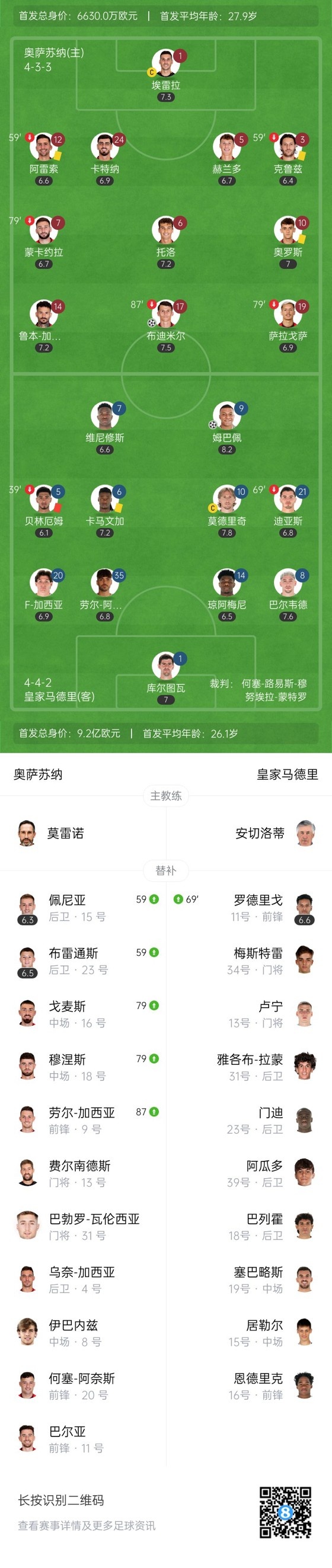 下半场补时4分钟,最终,奥萨苏纳1-1皇马。