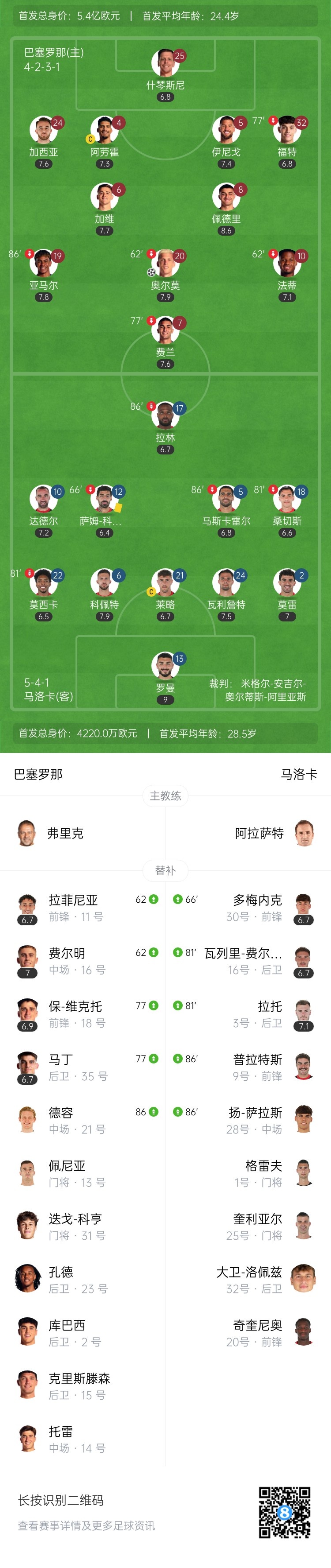 第12分钟,费兰-托雷斯接到队友传球,转身弧顶处的射门被对方门将扑出,亚马尔小角度补射再次被挡出。↓