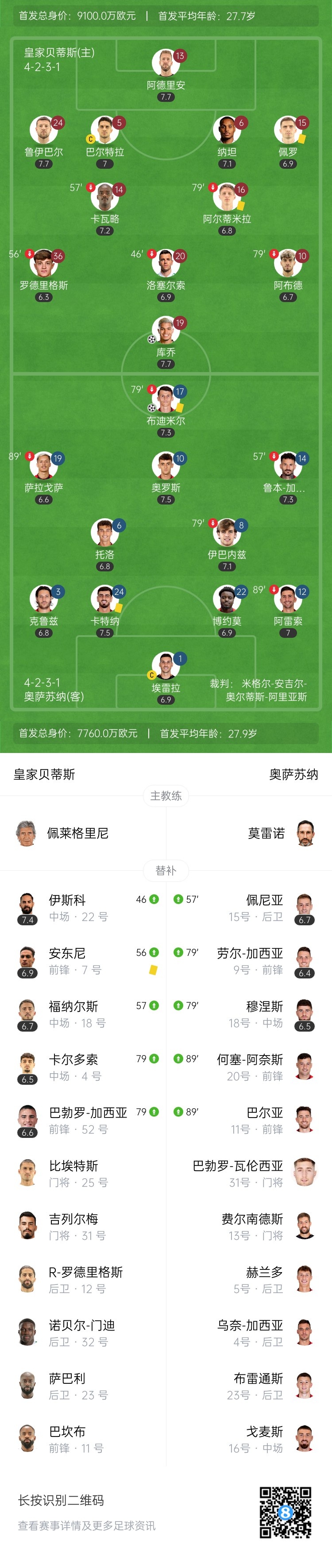 3轮连胜终结!贝蒂斯1-1奥萨苏纳距欧冠区3分 伊斯科助攻库乔破门