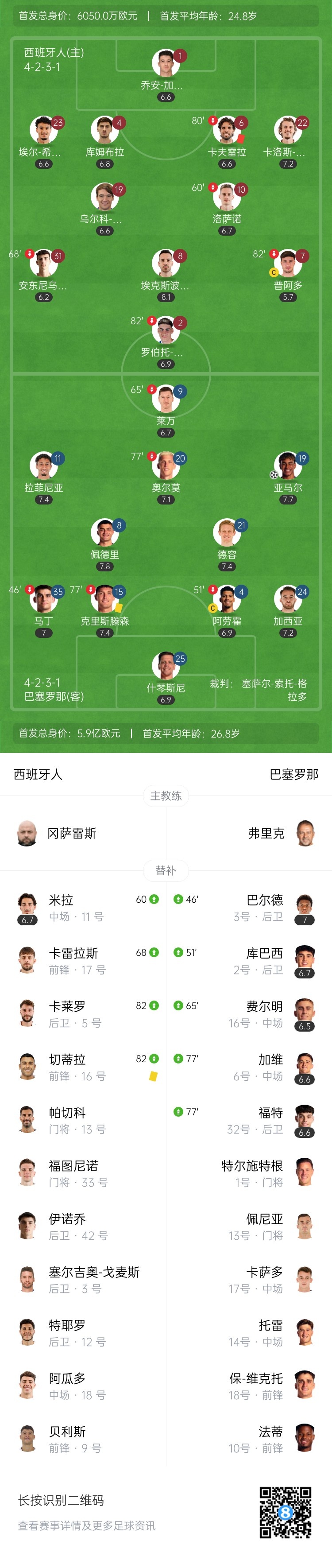 第80分钟,卡夫雷拉边路故意挥拳击打亚马尔腹部,主裁通过VAR回放,向卡夫雷拉出示红牌!西班牙人10人应战↓