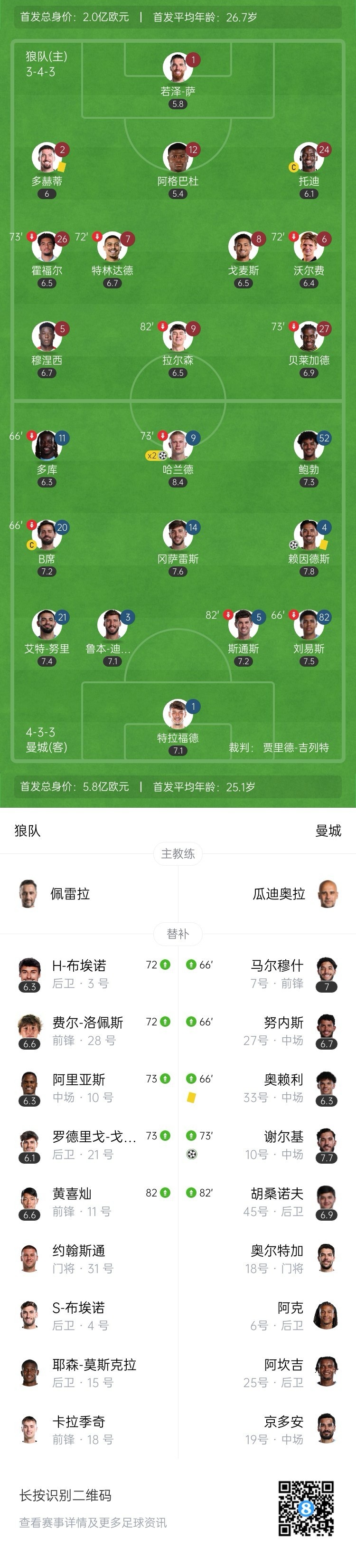 全场比赛结束,曼城4-0狼队。
