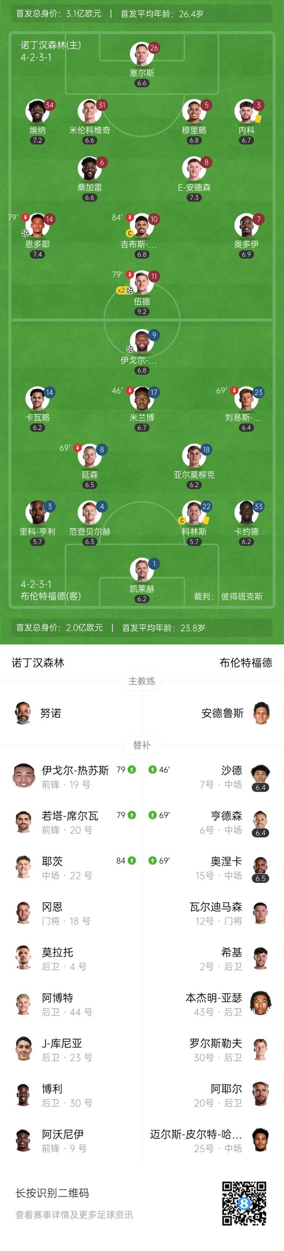 第5分钟,森林闪击得手!左路角球开到禁区后点伍德停球后抽射破门,森林1-0布伦特福德。↓