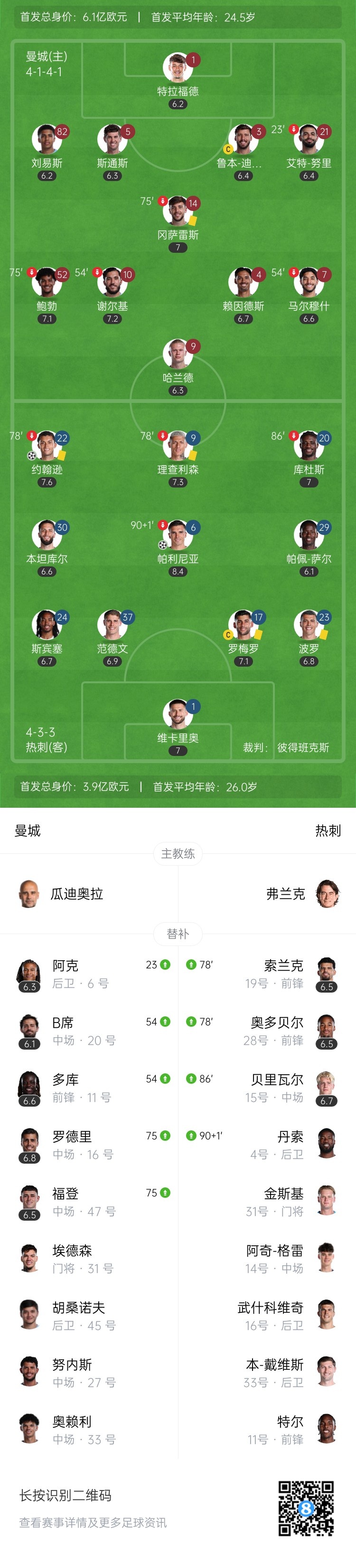 第35分钟,理查利森右路接球杀到禁区边,横传禁区内,布伦南-约翰逊包抄破门!边裁示意越位,但VAR改判进球有效!热刺1-0领先曼城↓