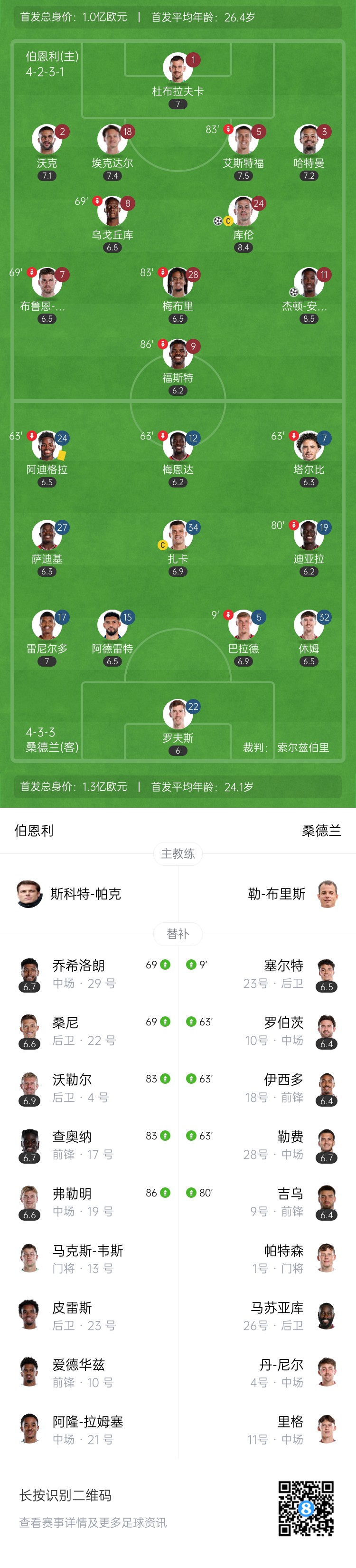 全场比赛结束,伯恩利主场2-0战胜桑德兰。