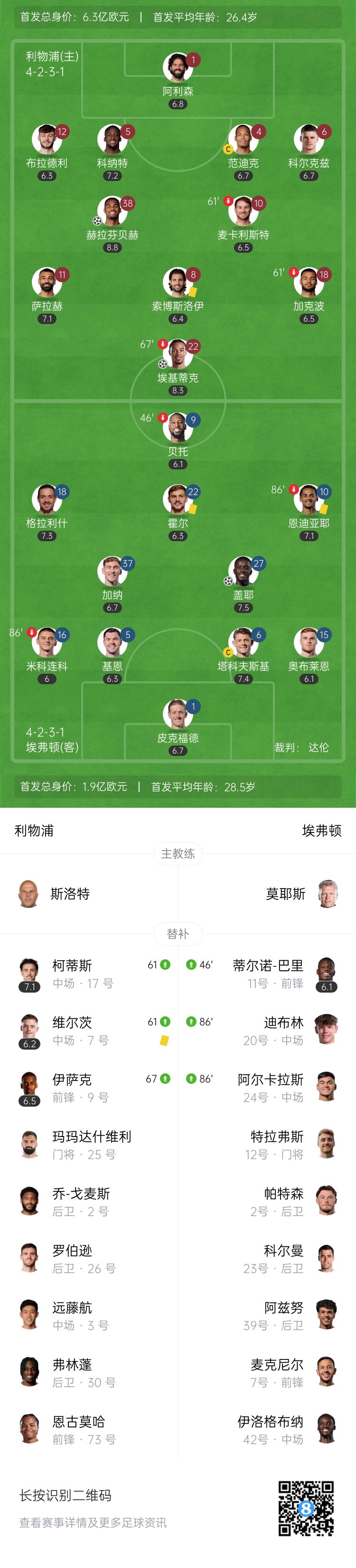 下半场伤停补时3分钟,全场比赛结束,最终利物浦2-1埃弗顿。