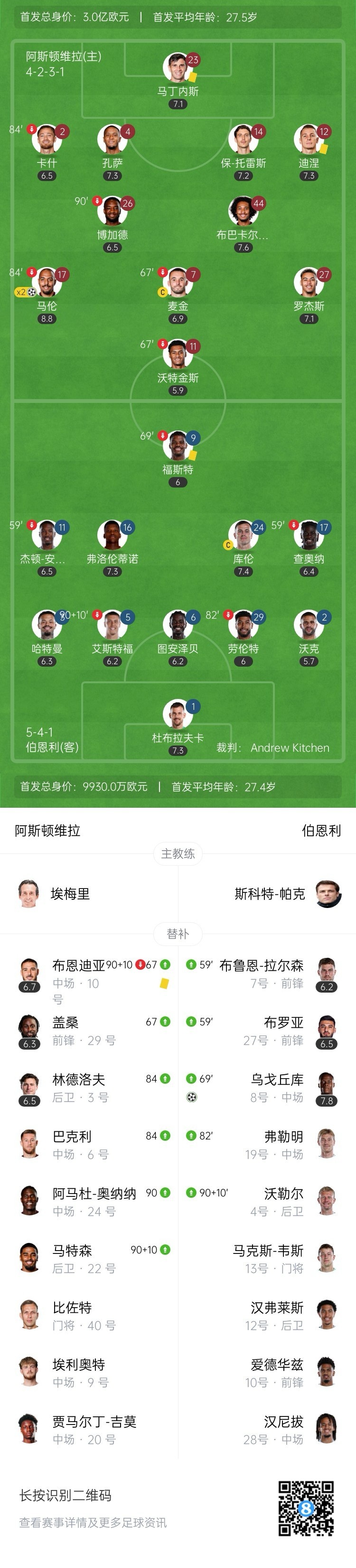 全场比赛结束,阿斯顿维拉主场2-1战胜伯恩利。
