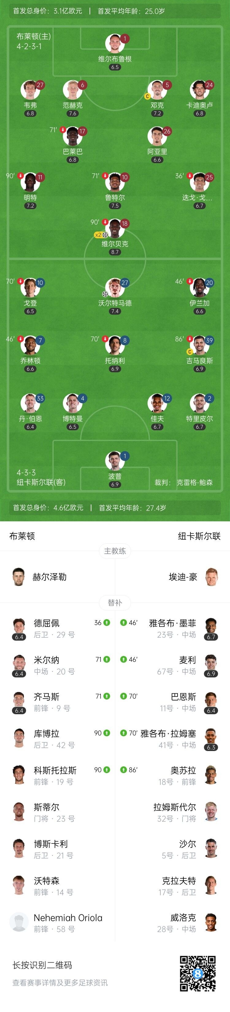 8轮仅2胜!纽卡1-2布莱顿 沃尔特马德脚后跟破门34岁维尔贝克双响