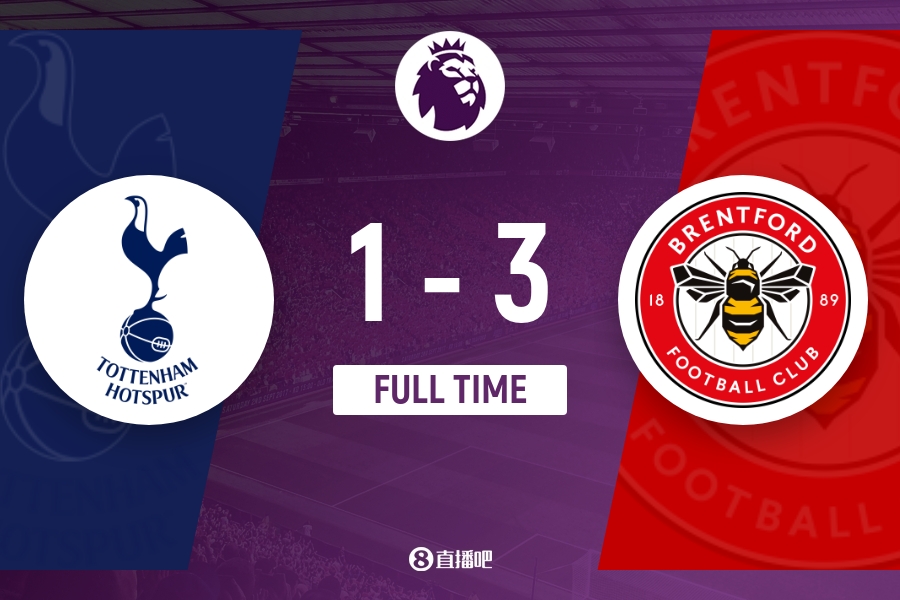 下半场补时9分钟。最终全场比赛结束,热刺主场1-3布伦特福德。