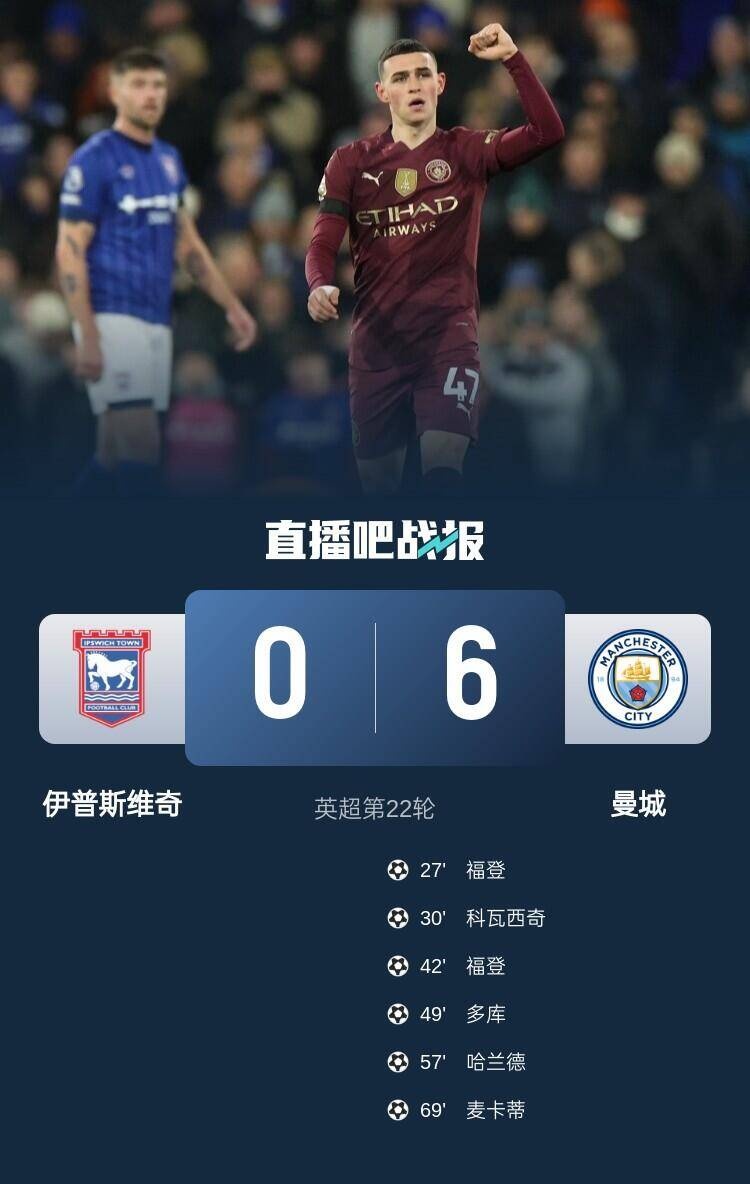 1月20日讯 北京时间1月20日凌晨0:30,2024-25赛季英超联赛第22轮,曼城在波特曼路球场球场客战伊普斯维奇。上半场哈兰德失单刀,福登2射1传,科瓦西奇破门,曼城暂3-0伊普斯维奇;下半场多库传射,哈兰德建功,麦卡蒂替补破门,最终曼城6-0伊普斯维奇,积分来到38分,重返前四。