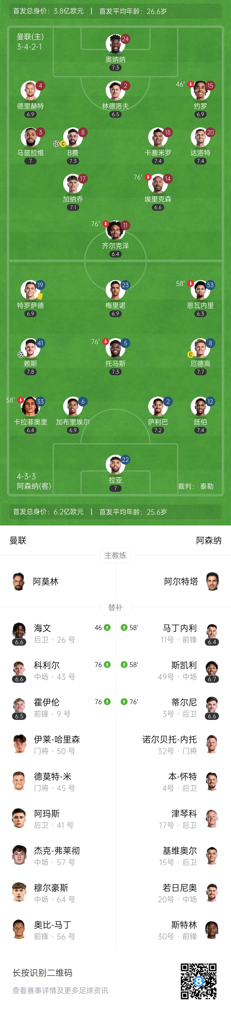 全场结束,曼联1-1阿森纳。