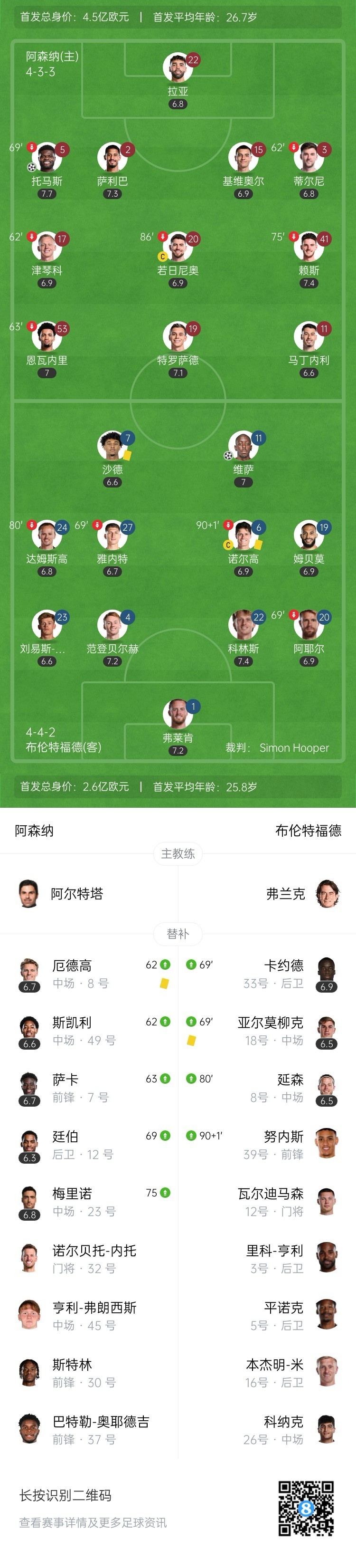 全场比赛结束,阿森纳主场1-1战平布伦特福德。