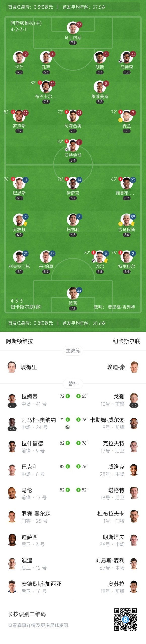 下半场补时6分钟,维拉4-1纽卡。