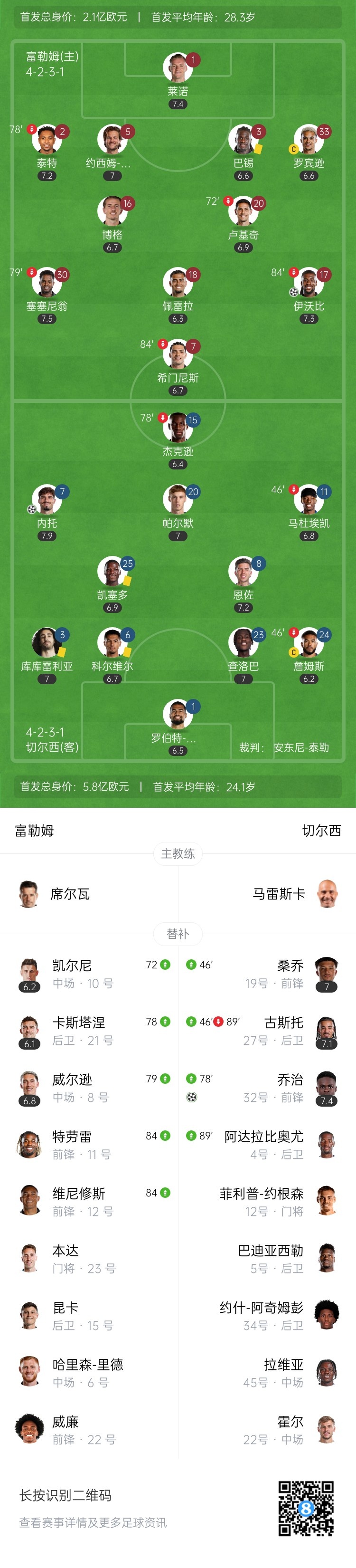 下半场伤停补时6分钟,全场比赛结束,最终切尔西2-1富勒姆。