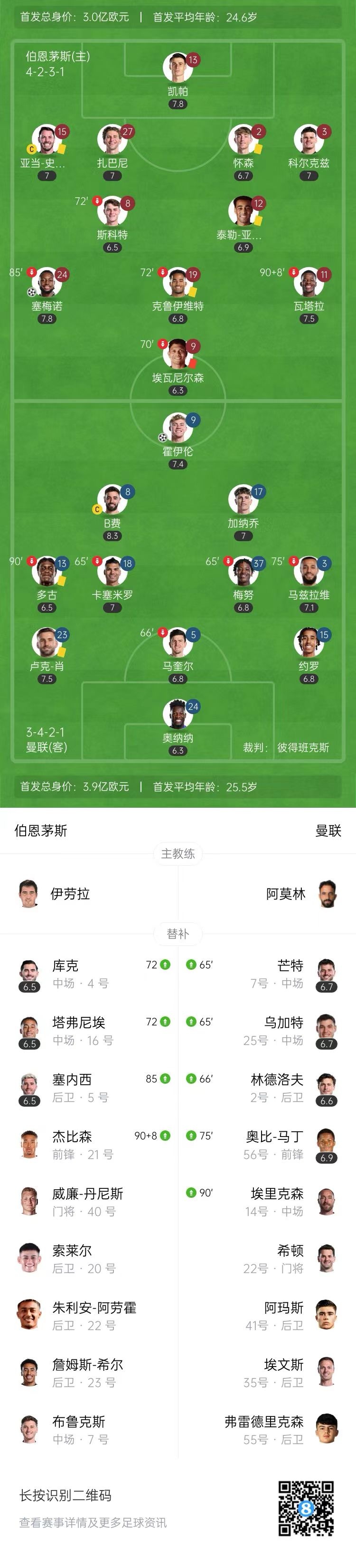 第93分钟,曼联角球开出,埃里克森凌空打门被挡出,加纳乔禁区断球再打门被封堵,B费禁区外跟进远射,击中边网。↓