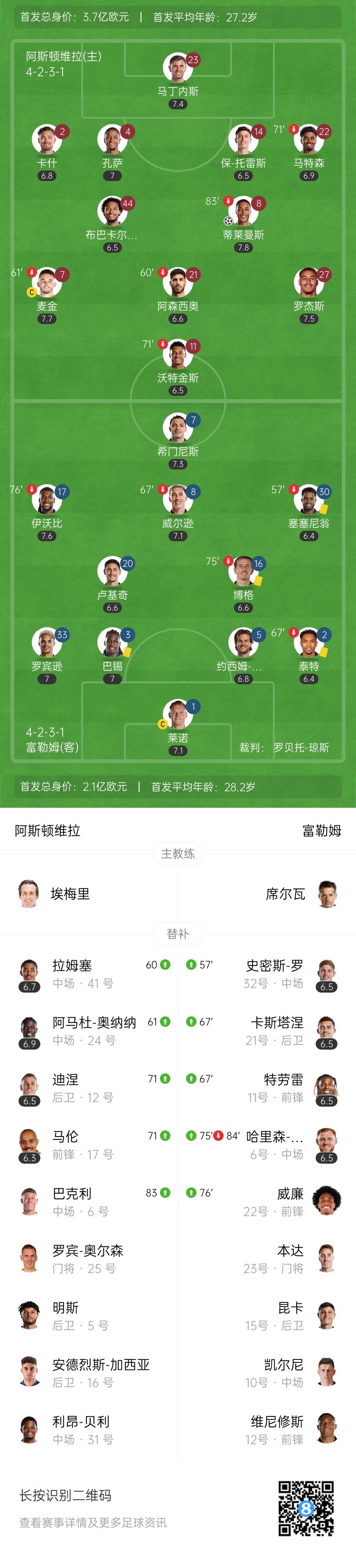 全场比赛结束,最终维拉1-0富勒姆。