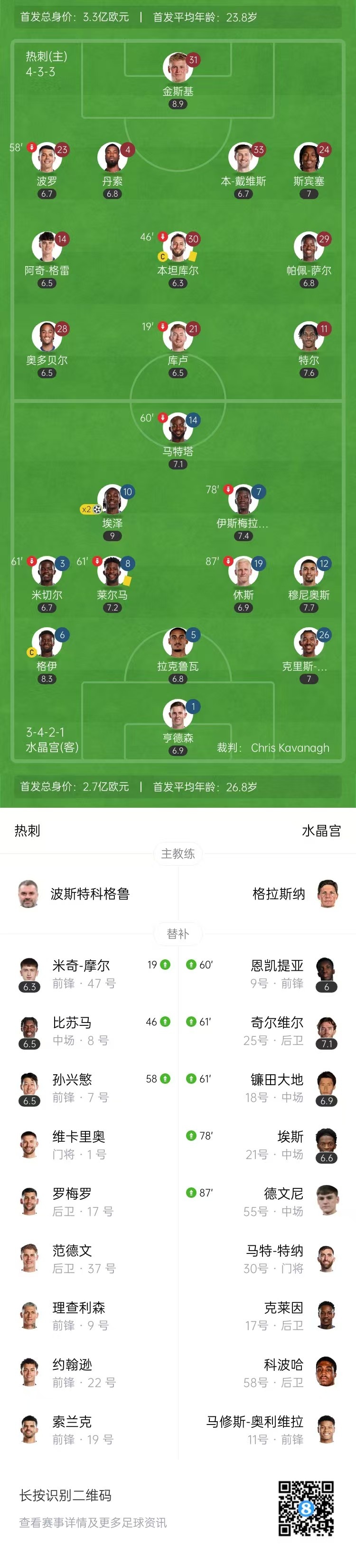 第33分钟,热刺禁区里解围失误,水晶宫一脚抢射打飞。↓