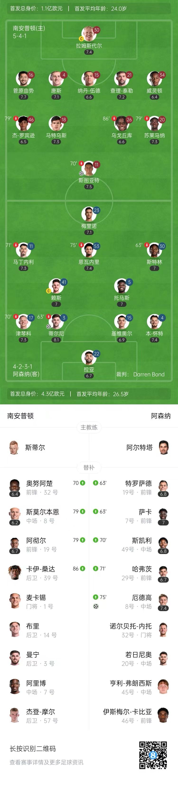 第30分钟,阿森纳后场失误,南安普顿禁区左侧传中,斯图亚特头球攻门顶偏。↓