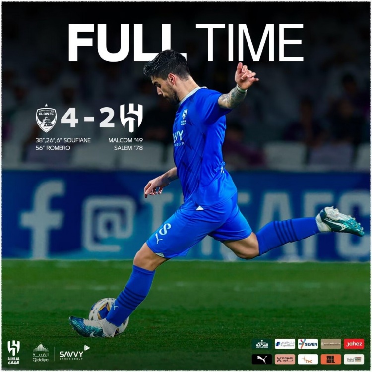 下半场补时7分钟,艾因4-2利雅得新月。