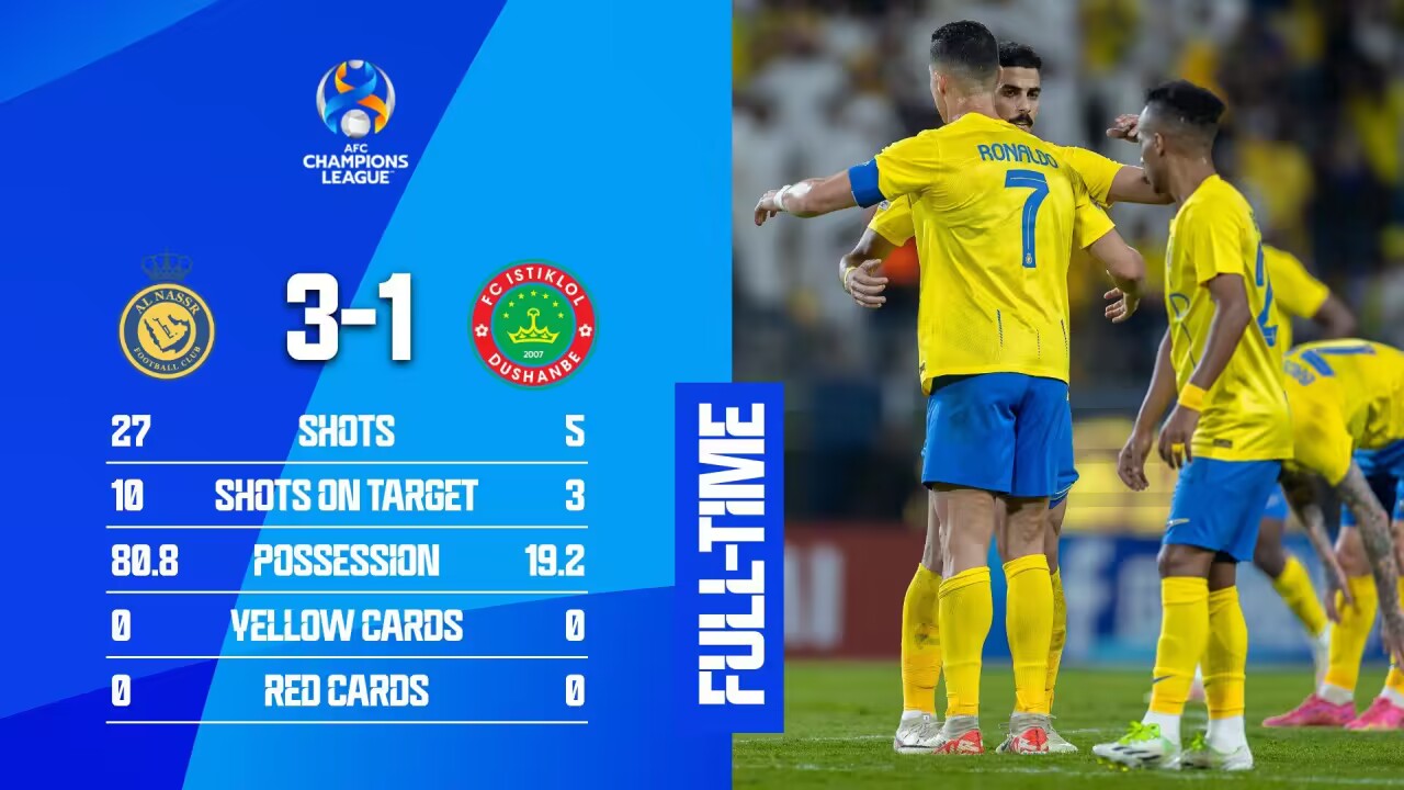 亚冠-C罗斩亚冠首球&10场11球6助攻 利雅得胜利3-1逆转杜尚别独立