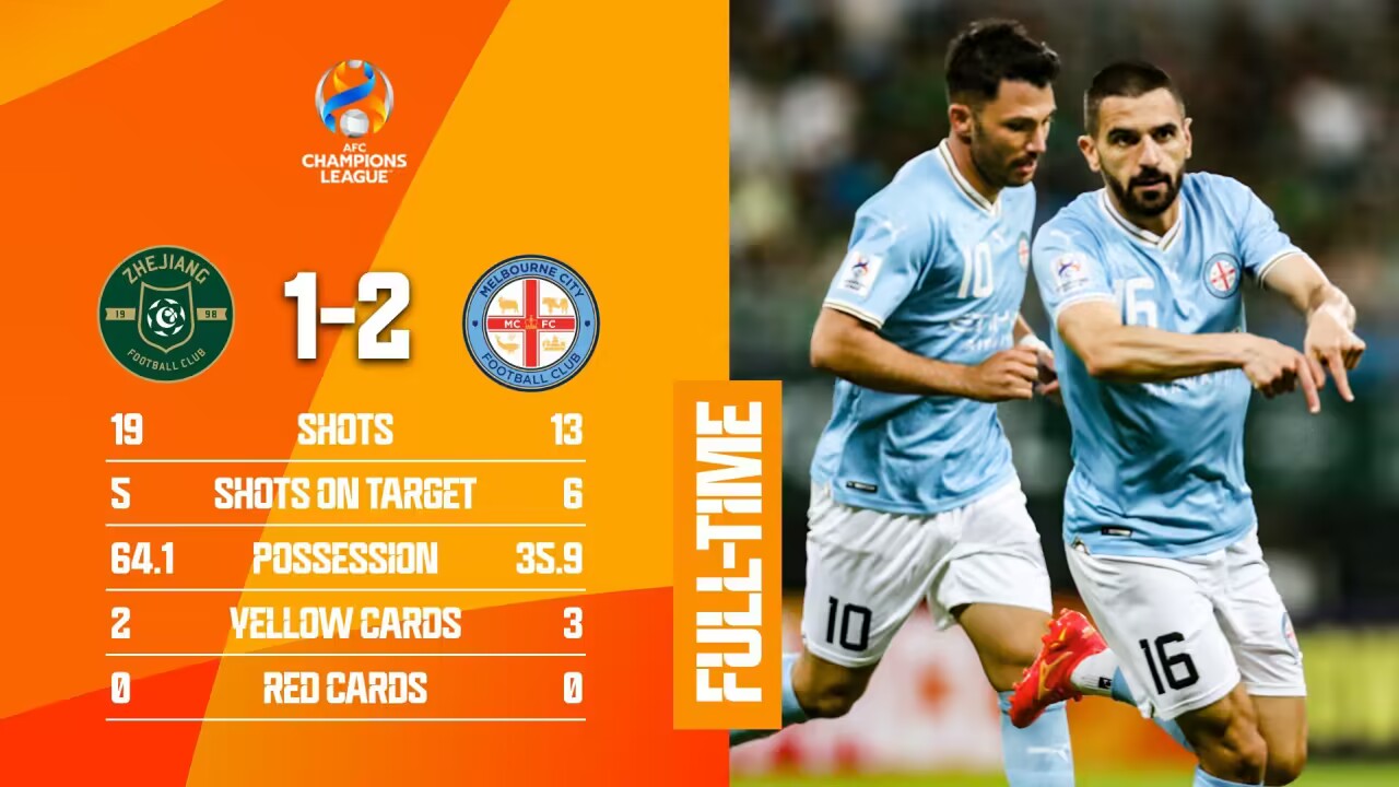 全场比赛结束,浙江队1-2不敌墨尔本城。