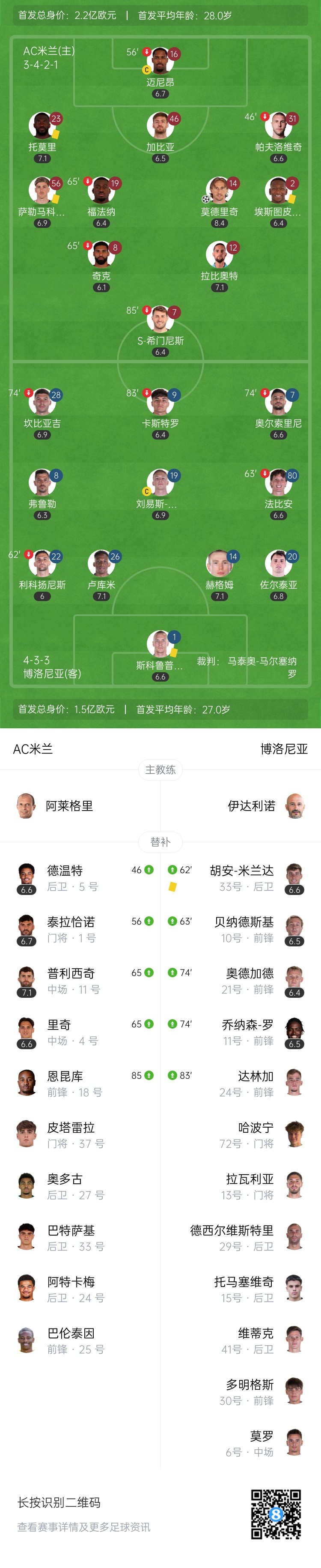 9月15日讯 北京时间9月15日凌晨2:45,2025-26赛季意甲联赛第3轮,AC米兰坐镇圣西罗球场迎战博洛尼亚。上半场坎比亚吉破门但因越位在先无效,埃斯图皮尼安和S-希门尼斯中柱,米兰暂0-0博洛尼亚;下半场迈尼昂伤退,莫德里奇打进个人米兰生涯首球,里奇和S-希门尼斯中柱,恩昆库禁区内摔倒,VAR介入,主裁判取消点球判罚并向阿莱格里出示红牌,最终AC米兰1-0博洛尼亚,联赛两连胜。