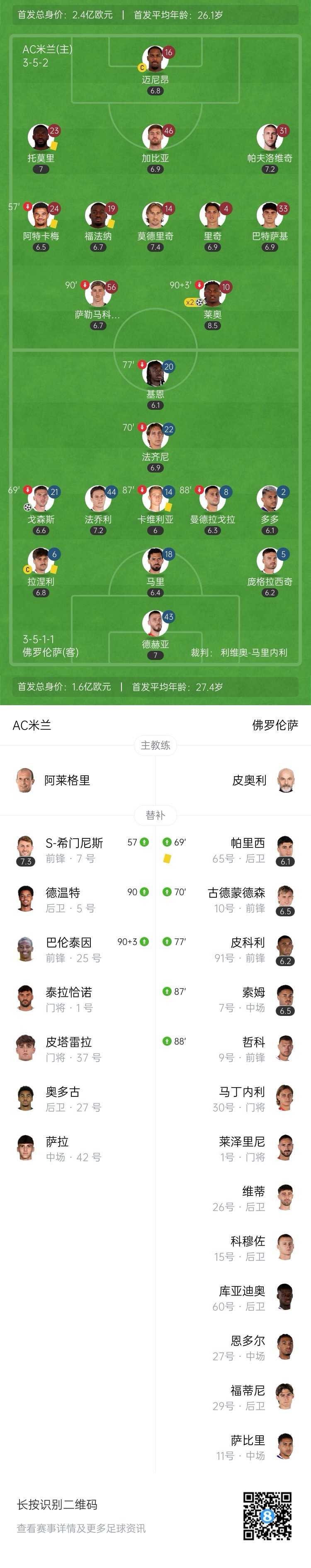 全场比赛结束,AC米兰主场2-1逆转佛罗伦萨。