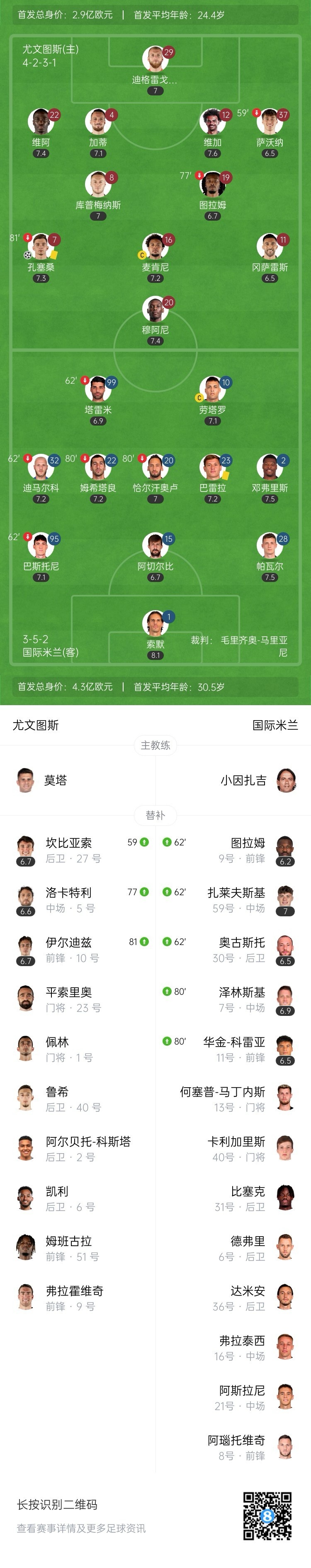 全场比赛结束,尤文图斯主场1-0战胜国际米兰。