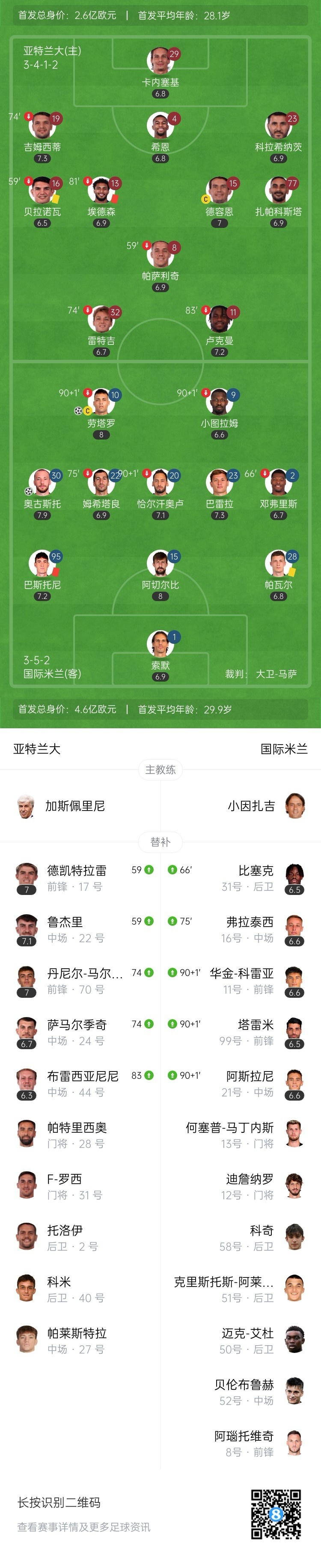 全场比赛结束,国米2-0亚特兰大。