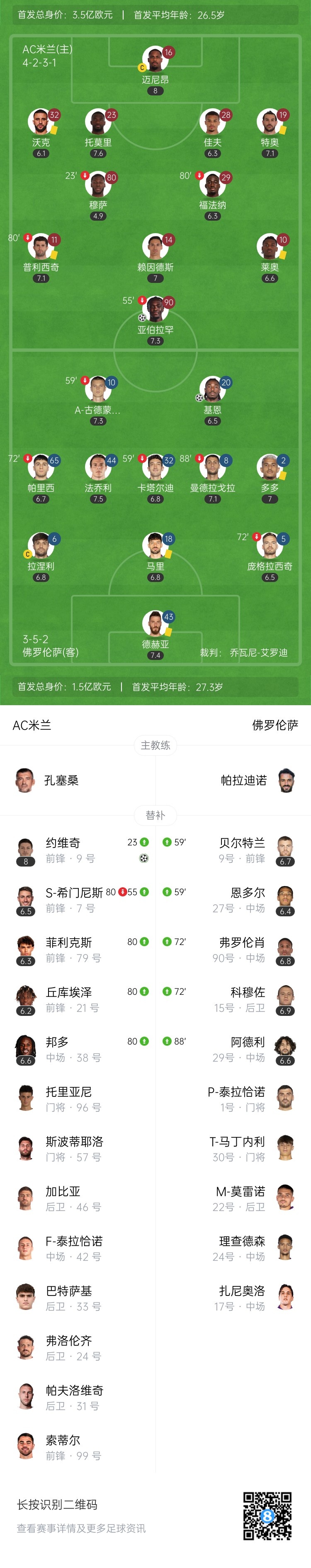 近7轮仅2胜!米兰连扳两球2-2佛罗伦萨 穆萨送礼鸭脖约维奇破门