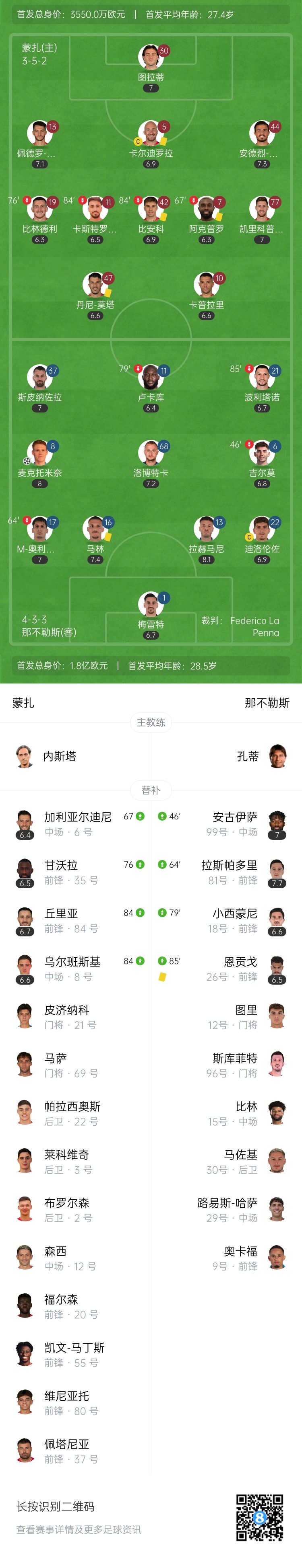 第72分钟,拉斯帕多里大禁区线上起高球吊到小禁区,麦克托米奈甩头攻门得手!那不勒斯1-0蒙扎↓
