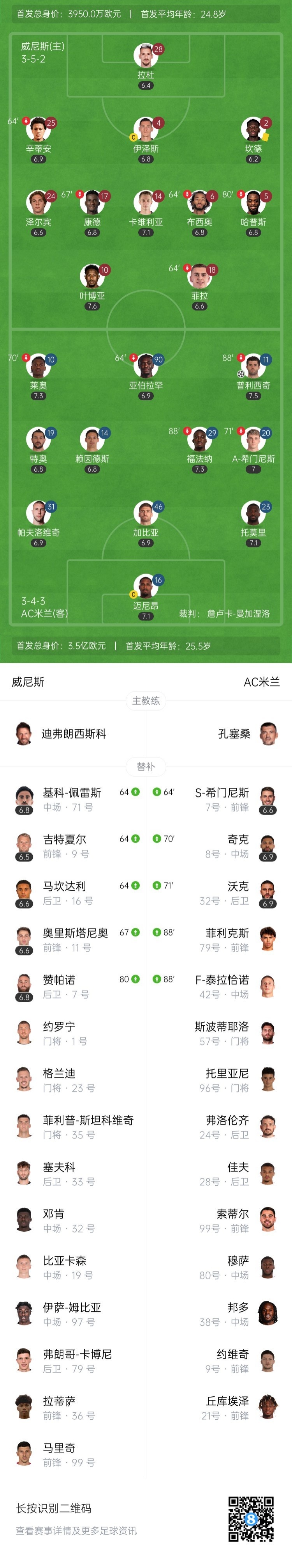 4月27日讯 北京时间4月27日18:30,2024-25赛季意甲联赛第34轮,AC米兰做客皮埃路易吉-彭佐体育场对阵威尼斯。上半场福法纳助攻普利西奇破门,叶博亚进球被吹,AC米兰暂1-0威尼斯;下半场S-希门尼斯补时建功,最终AC米兰2-0战胜威尼斯,距欧冠区6分。