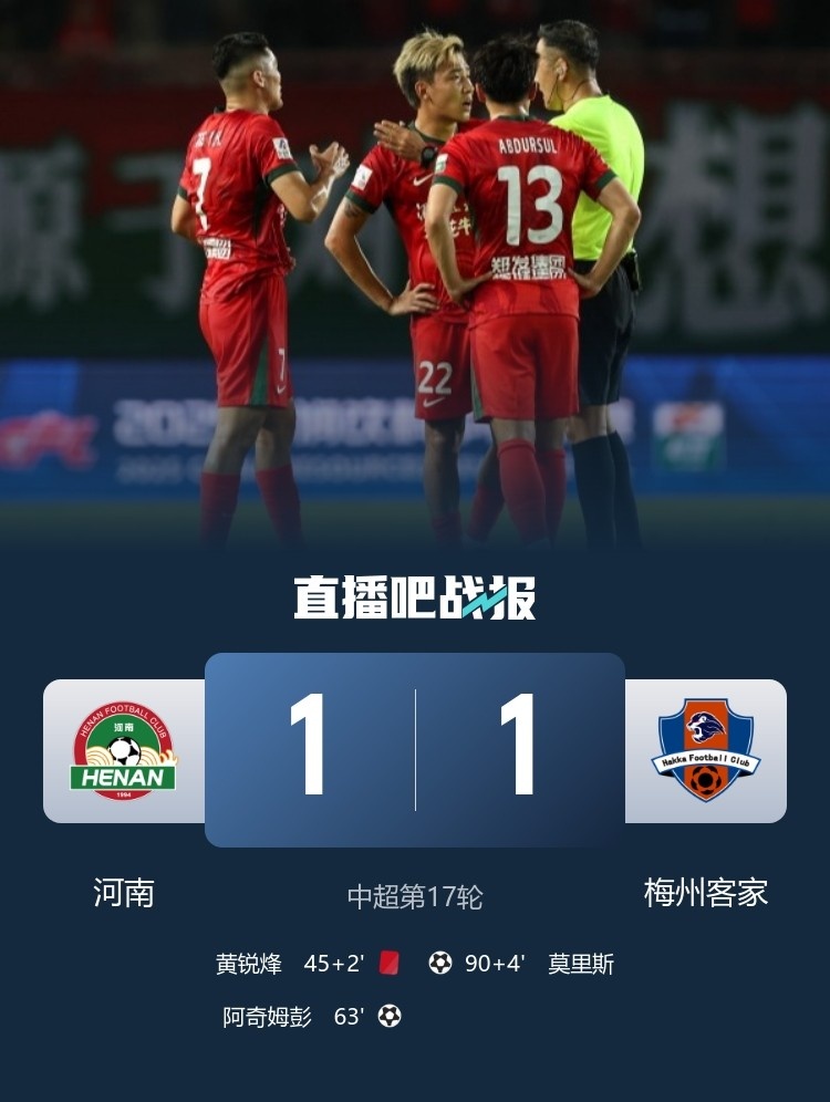 7月19日讯 北京时间7月19日晚上20:00,中超第17轮,河南坐镇郑州航海体育场迎战梅州客家。上半场,黄锐烽直红,恩戈姆伤退。下半场,阿奇姆彭头球破门,莫里斯94分钟绝平。全场比赛结束,河南1-1梅州客家。本场过后,河南4轮不胜,积16分排名第13;梅州9轮不胜,积13分排名第14!