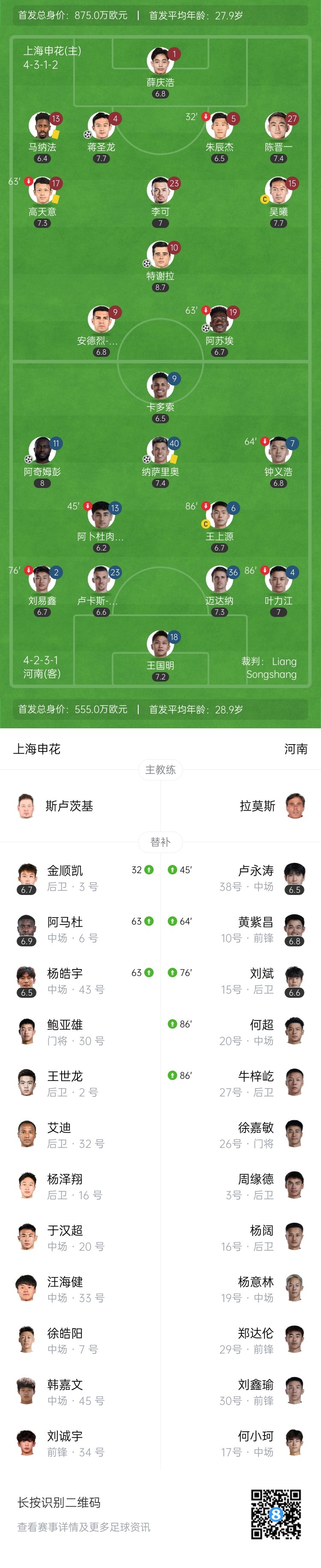 第45+7分钟,阿卜杜肉苏力被抢断,申花迅速进攻,特谢拉接到队友做球,大禁区线上一脚抽射打进,上海申花2-1河南。↓