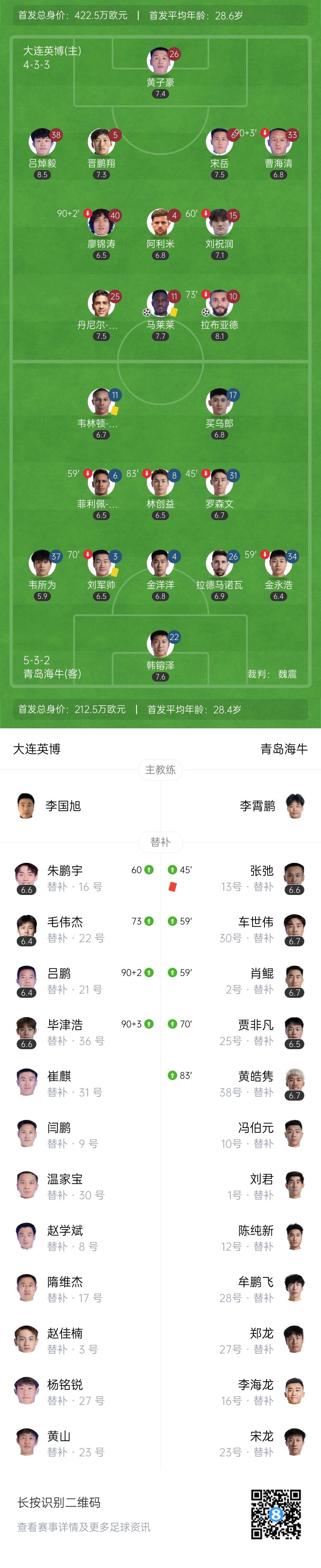 第90+10分钟,吕焯毅禁区内倒地,主裁判判罚点球!马莱莱主罚命中!大连英博2-0领先青岛海牛↓