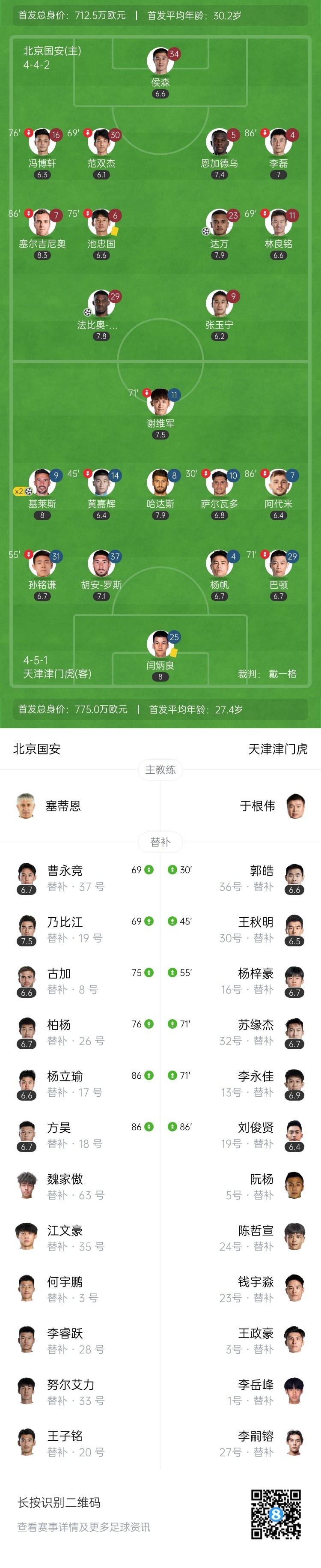 全场比赛结束,国安2-2战平津门虎。