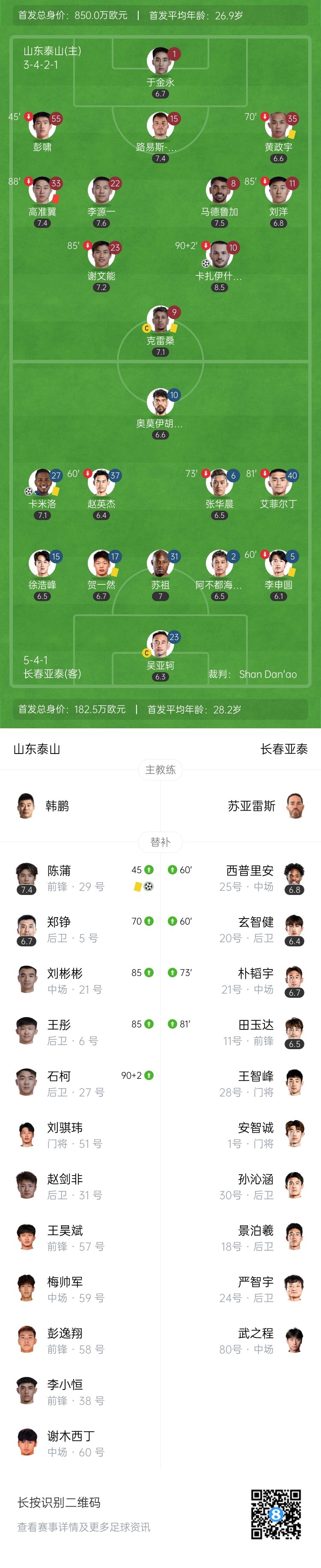 8月9日讯 北京时间8月9日19:00,中超联赛第20轮,山东泰山坐镇济南奥体中心迎战来访的长春亚泰。上半场奥莫伊胡安弗面对空门机会没有打进,卡扎伊什维利接到高准翼助攻头球建功,连续3场比赛破门,山东泰山暂1-0长春亚泰;下半场谢文能助攻陈蒲再下一城,胡安-卡米洛凭借个人能力为长春亚泰扳回一球,高准翼染红,最终山东泰山2-1战胜长春亚泰,积分来到31分,升至第五位,长春亚泰五轮不胜,仍在积分榜垫底。