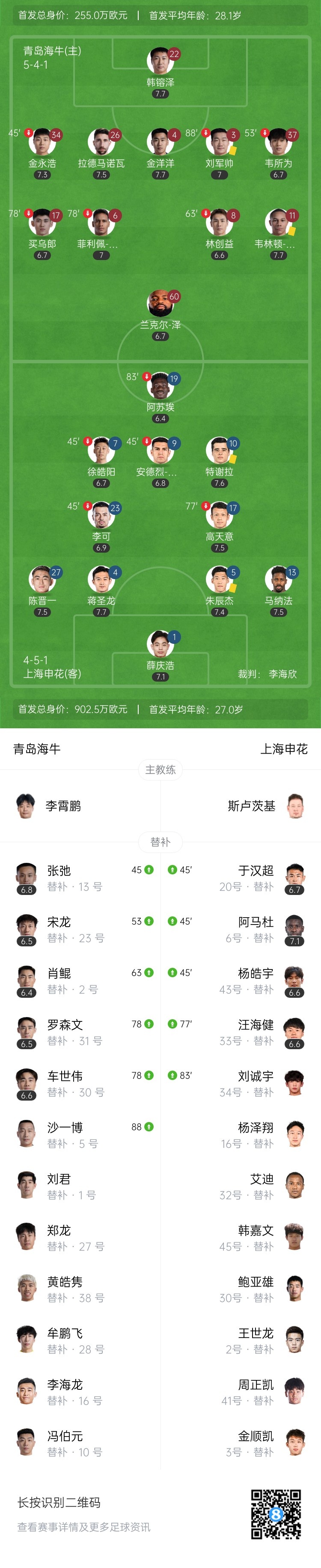 全场比赛结束,最终上海申花1-0青岛海牛。