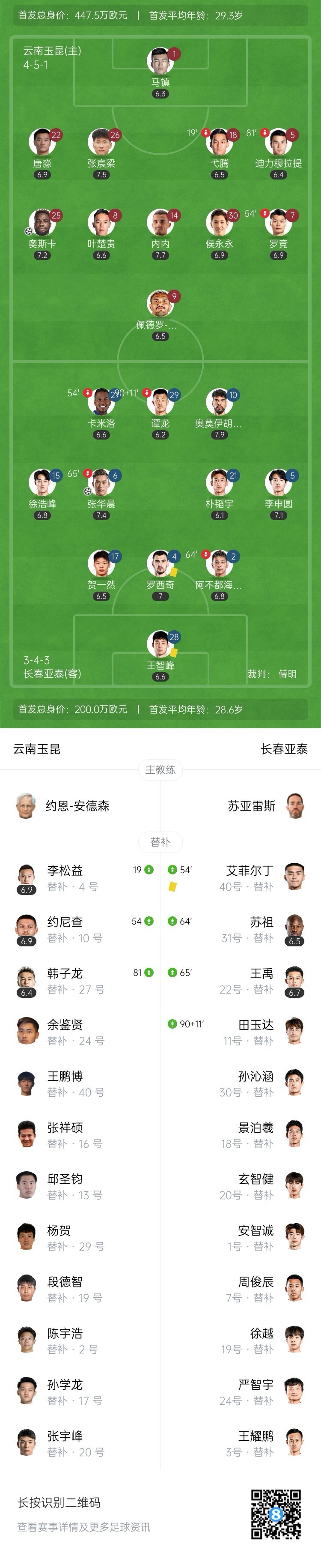 全场比赛结束,长春亚泰客场1-1战平云南玉昆。