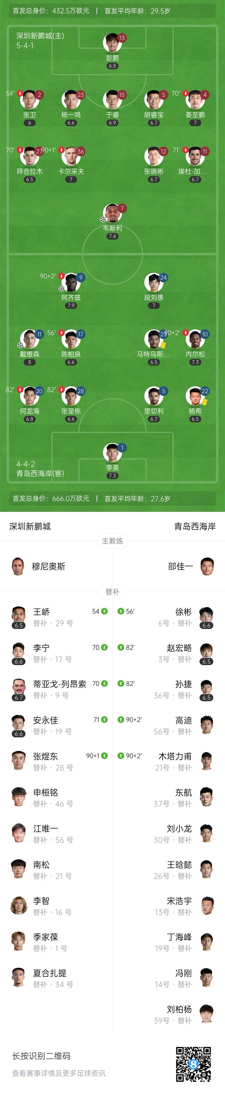 9月28日讯 北京时间9月28日19:35,中超第26轮,深圳新鹏城在深圳体育中心体育场迎战青岛西海岸。上半场,韦斯利闪击破门,戴维森扳平,马特乌斯假摔染黄;下半场,杨一鸣手球送点,阿齐兹点射建功。最终,深圳新鹏城1-2不敌青岛西海岸遭遇三连败。积分榜上,新鹏城积20分排在第13位,领先降级区2分,西海岸25战33分升至第8位。
