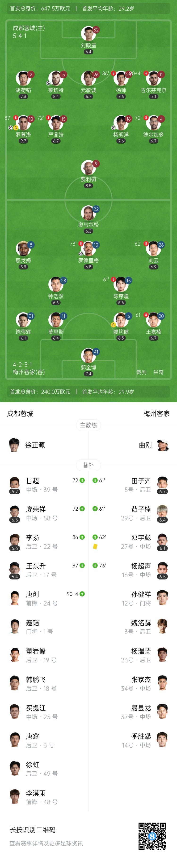 距榜首2分!蓉城3-1梅州止两连平 罗慕洛传射莱切特&杨明洋破门