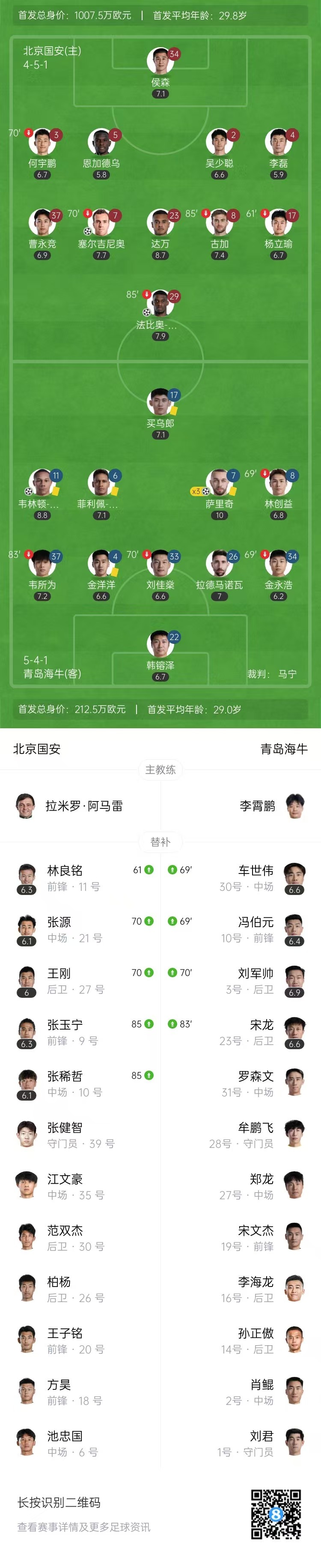 萨里奇主罚点球扳平比分,青岛海牛1-1北京国安。↓