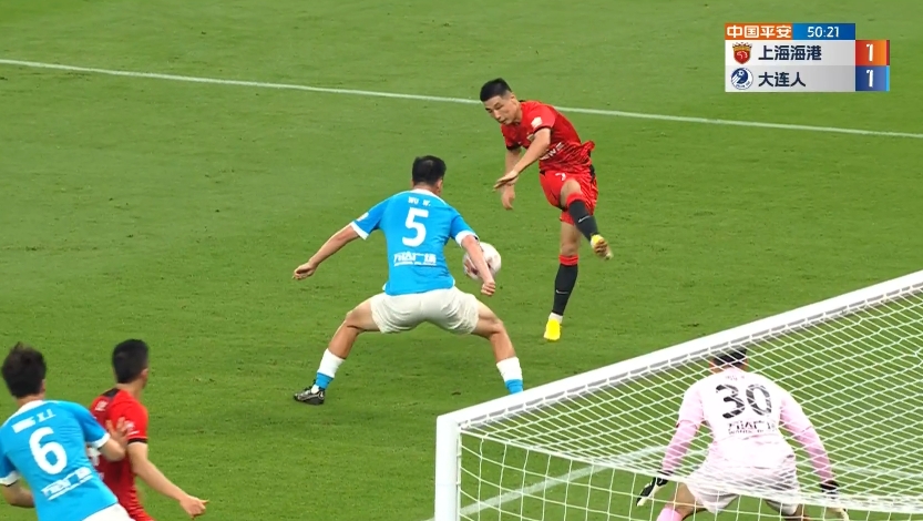 第45+4分钟,吕文君左路传中,中路李圣龙高高跃起头球破门,上海海港1-1扳平比分↓