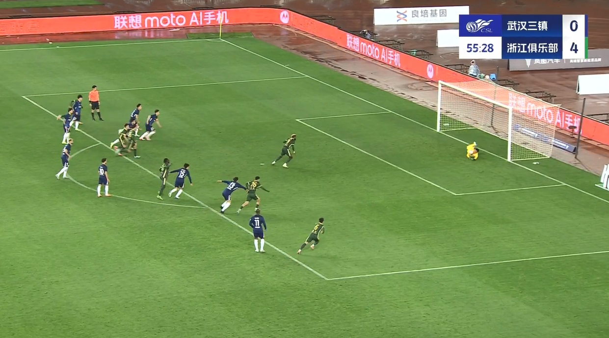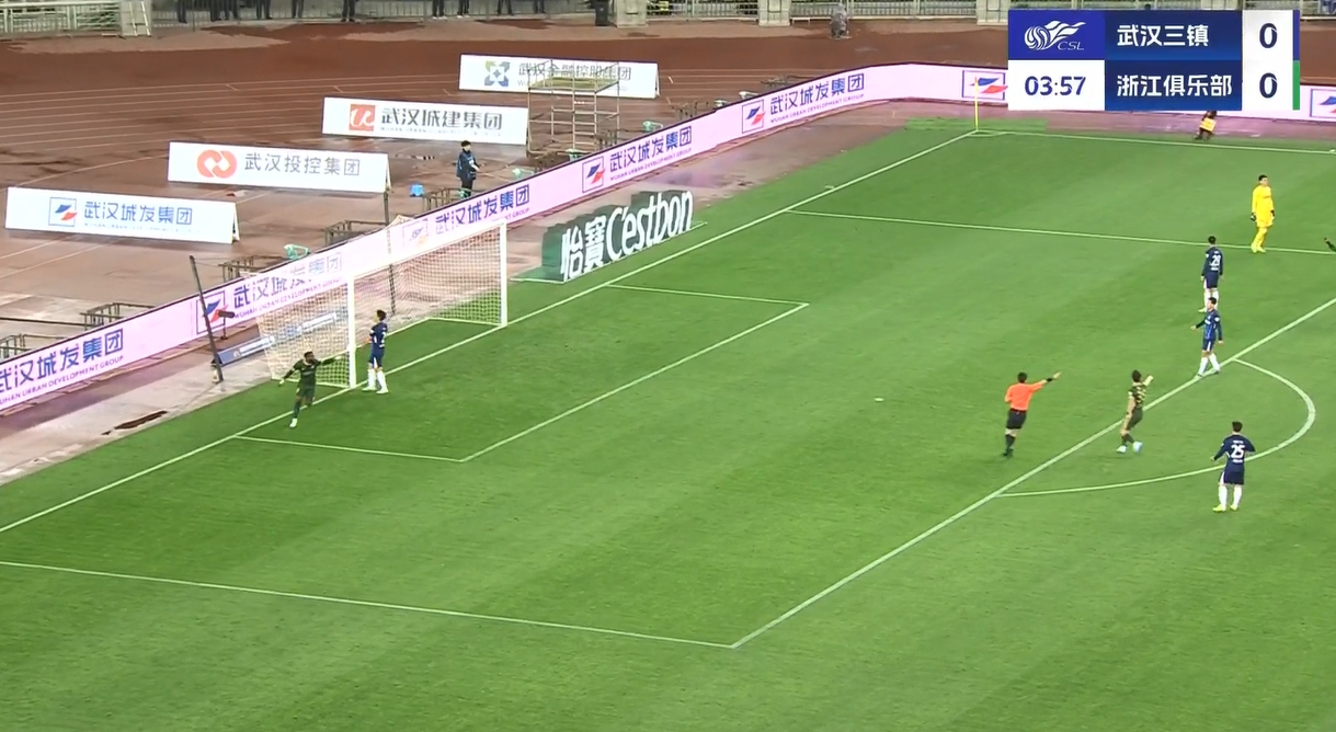 下半场补时8分钟。最终全场比赛结束,武汉三镇0-4浙江队。