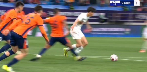 第98分钟,朱鹏宇禁区内带球被踩倒,主裁判第一时间没有吹罚,随后查看VAR后,主裁判吹罚点球。第99分钟,马莱莱主罚点球被牟鹏飞扑出。↓