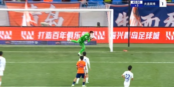 第32分钟,大连英博客场取得领先,拉布亚德左路角球开至后点被解围出禁区,吕焯毅停球之后起脚远射,皮球飞入远角,英博1-0领先青岛海牛。↓